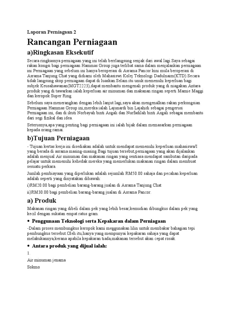 Abdul said ambotang bil. Okeyy yang sis bagi dekat atas ini perkara yang perlu ada dalam rancangan perniagaan anda. View laporan perniagaanpdf from CHEMICAL E EH 220 at MARA University of Technology.